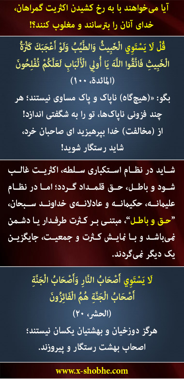 مگر عقل و جهل، نور و ظلمت، مُرده و زنده، کَر و شنوا، کور و بینا، ارزش و ضد و ارزش، تلاش و تنبلی و تنپروری و خلاصه ضعف و نقص با قوت و کمال مساوی هستند که کسی انتظار داشته باشد نتایج هر چیزی، هر راهی و هر کاری مساوی باشد؟! آیا آدمی خود با وجود تمامی ضعفش در علم، حکمت، قدرت و عدالتش، دانا و نادان را مساوی میداند؟!