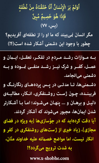 ●- مکرر بیان شد که دشمنی، مرحلهی بعد از کفر و انکار است. مکرر بیان شد که اگر به جوّسازی [به ویژه در فضای مجازی] دقت کنید، زیاد بحثی در انکار وجود خدا نیست (چون قابل انکار نیست)، بلکه سعی در ایجاد بغض و دشمنی با او در قلوب میشود! درست همان اخلاق ابلیس لعین است که منتشر و القا میگردد؛ او هیچ گاه منکر وجود خدا نشد، بلکه به عزت او قسم خورد که تا ابد با او دشمنی کند و چون میدانست که قدرت مقابله با او را ندارد، قسم خورد که بندگانش را اغوا و منحرف نماید! لذا به تابعین خود نیز میگوید: «ای احمق! خدا را انکار نکن که این دلیل بر جهل خودت میباشد، بلکه بگو هست، ولی با او دشمنی کن! بگو: علم ندارد، حکمت ندارد، عدالت ندارد، رحمت ندارد ... و دائماً به او اعتراض داشته باش!